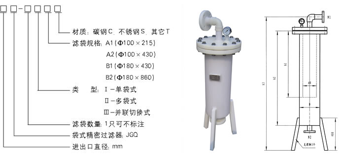 精细过滤器类型很多,本样本中提及到的精细过滤器结构或尺寸只是一种典型的工艺要求,为更适合您的要求,请详尽填写表格,对特殊产品。 袋 式 精 密 过 滤 器 一、产品特性 袋式精密过滤器是一个简便、高效、经济的过滤设备。需要过滤的流体从上口进入滤袋,杂质被阻挡在袋内,从而得到清洁的流体。过滤精度1~1000um。滤袋的材料有尼龙、聚丙烯、聚脂、聚芳酰胺、聚四氟乙烯、羊毛等。